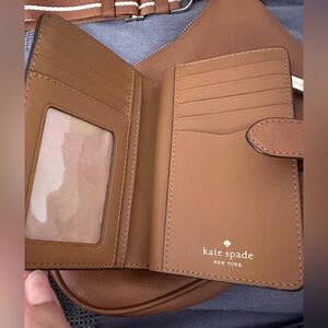 Chic brown shoulder bag by Kate Spade and matching wallet . Features a stylish striped strap. Ideal for everyday use.