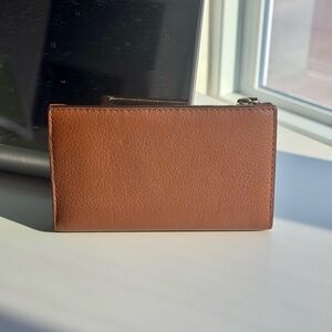 Elegant brown leather wallet. Features gold zipper. Compact and stylish.