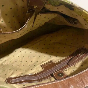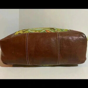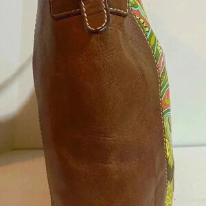 Stylish hobo bag with a vibrant paisley pattern. Features brown leather accents. Perfect for everyday use.