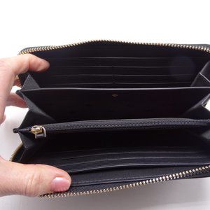 Interior: 12 credit card slots, 2 slip pockets, zip coin compartment, 3 gusset compartments