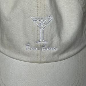 Baseball cap is David & Young. Adult sized adjustable baseball cap with embroidered “tini time” and martini glass in white.