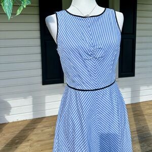 This is a preloved dress by Kate Spade that was rented through Rent the Runway. It is sleeveless with a stripe design in blue and white. It falls around mid length on me (5’4”).