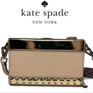 Creme and metallic gold-tone leather Kate Spade New York Spice Things Up Camera clutch with gold-tone hardware, detachable tassel embellished shoulder strap, striped woven lining and zip-around closure at top. Includes tag and dust bag.