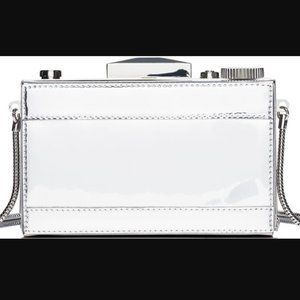 Measuring 3.5" x 5.9" x 1.8" inches, the Camera Shoulder Bag is made with metallic pvc leather with matching trim and is adorned with 14-karat gold plated hardware which makes the piece more perfect in every way.