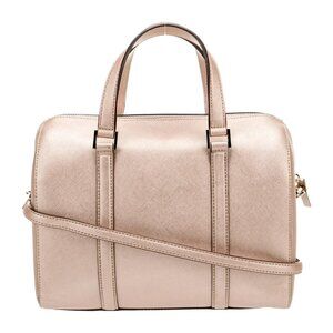 The Kate Spade satchel in a refined rose gold color offers a structured silhouette with double top handles and a detachable shoulder strap. Its minimalist design is complemented by smooth, leather material and elegant metal hardware, making it a versatile accessory for any occasion.