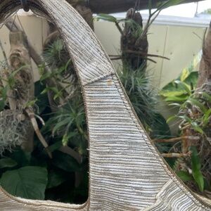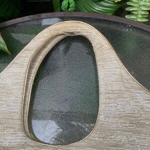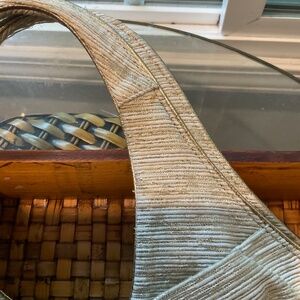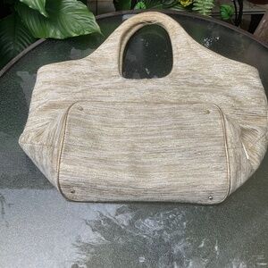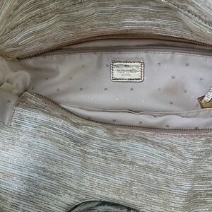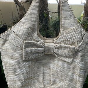 Lovely Kate Spade Large Bow Champagne & Gold Spun Fabric Shoulder Bag. There Are Some Blemishes PLEASE SEE PICS. A Couple Of Small Spots On Front Of Bag. Fraying On 1 Handle. Mild Wear Near Base Of Bag. Inside Is Clean And Very Nice. Still, Bag Is Very Pretty & Fully Functional.