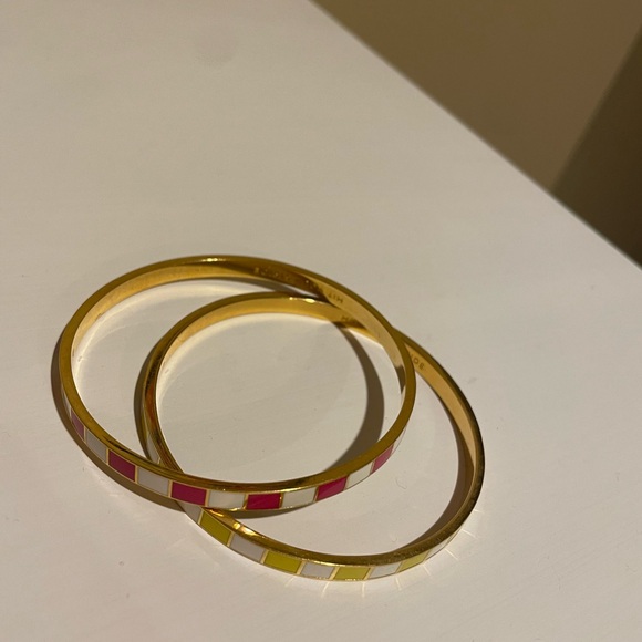 This stunning bangle set features a luxurious gold finish with vibrant pink accents. Perfect for adding a touch of elegance to any outfit.