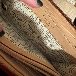 Vibrant red wallet with a glossy finish. Features a gold logo plaque. Good used condition.