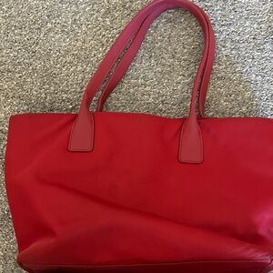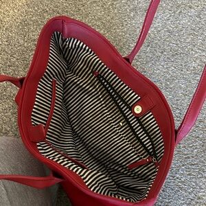 Elegant red tote with sleek design. Perfect for daily use. Features sturdy handles and signature logo.