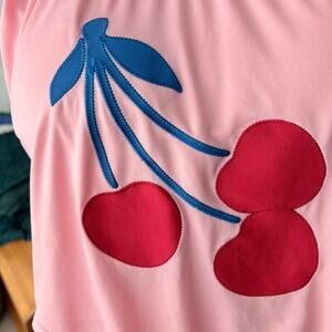 Kate Spade New York cherry print one-piece swimsuit in a bright pink with bold red cherries and navy stems. Size small. Scoop neckline, lined with removable soft cups. A playful retro style that’s perfect for poolside lounging, lake weekends, or summer travel. Pairs well with a breezy white button-down or vintage denim shorts.