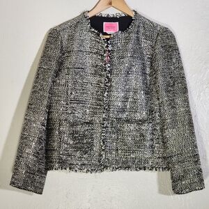 Elevate your style with this chic black and white tweed jacket. Perfect for any occasion, this jacket offers a sophisticated look with its classic design. Ideal for pairing with both casual and formal outfits.