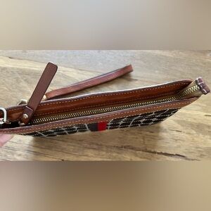 Printed geometric tile weaved fabric with brown & red stripe. Brown leather trim, removable leather wristlet strap, leather zipper pull. Top zip closure, classic red lined interior with green dots. Measures approx. 8”L x 4.25”H. Good used condition with minor imperfections! Classic beautiful accessory!
