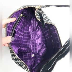 Excellent pre-loved condition. Vintage Noel Logo print from 2003. Black and gray canvas exterior with stunning royal purple lining. Black and White Varsity strip adds a fun twist. Black Patent Leather bottom and straps finish this contemporary look.