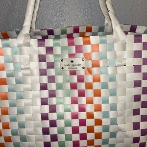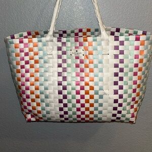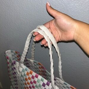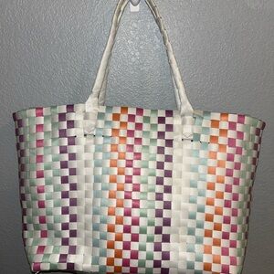 Vibrant tote with a checkered pattern. Features white, orange, purple, and red hues. Stylish and functional design.