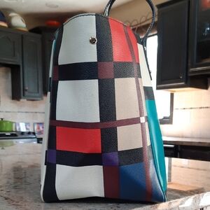 Fabulous multi-color color block Kate Spade tote. Incredible and fun bag with a handle drop of 9". The tote measures 11.5" x 11" x 8". This bag has been authenticated. Chic handbag with bold plaid pattern. Features teal, red, purple, and black accents. This is one to enjoy!