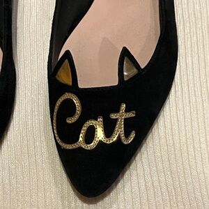 Kate Spade "Cool Cat" black and gold pointed flats Velvet Black w Gold Writing