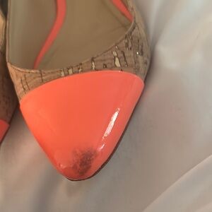 These Kate Spade flats feature a stylish two-tone design with a woven tan body and vibrant orange patent leather toe caps. The pointed toe silhouette and flat sole offer a blend of modern elegance and everyday comfort, making them a versatile addition to any wardrobe.