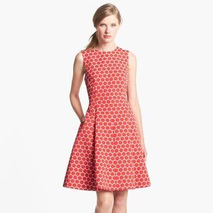 "A cheerful dot pattern enlivens this ultrafeminine fit-and-flare dress designed with handy side pockets."