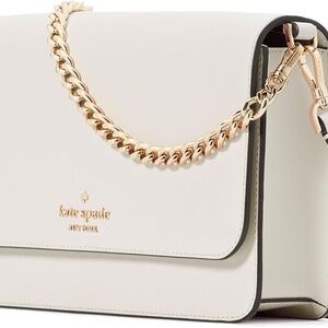The Kate Spade Cream Crossbody/Shoulder Bag is a chic accessory featuring a sleek flap-over design and a luxurious gold-tone chain strap. Its smooth leather-like finish and iconic gold logo add a touch of elegance, making it perfect for any stylish outing.