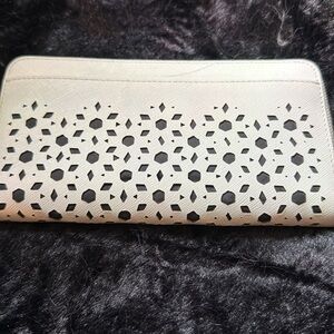 Elegant cream wallet with laser-cut design. Features zip-around closure. Stylish and functional.