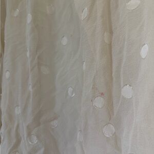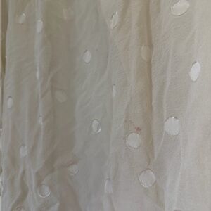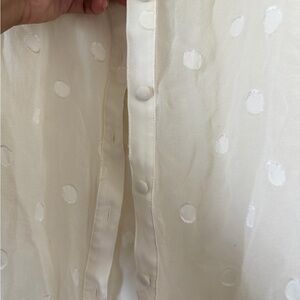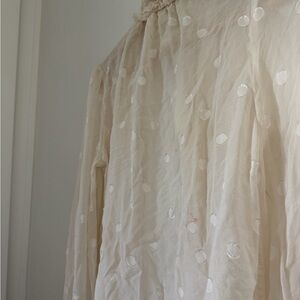 Chic cream blouse with ruffled details. Features subtle polka dots. Ideal for stylish occasions.