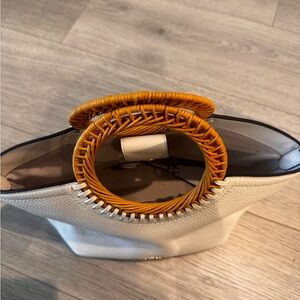 Chic cream tote with unique woven handles. Ideal for everyday use.