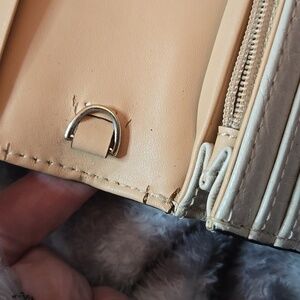 Elegant and stylish, this Kate Spade cream wallet features a beautiful floral design. Perfect for organizing your essentials with a touch of sophistication. Spots for 12 cards, hardware in good condition. 7.5 in L by 4 in H. All callouts in photos.