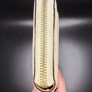 Cream Kate Spade wallet with pink interior. The zippers work great and the interior is CLEAN. It fits an iPhone 16 Pro so it can easily be used as a clutch. There are a few callouts (see below), but this wallet looks great!
