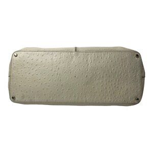 This bag from Kate Spade is in great condition. It is a cream, off-white color. In a refreshing beige hue that will brighten your look instantly this is a day to evening handbag that offers versatility. This is a Kate Spade Wellesley Quinn ostrich embossed handbag. The exterior is handcrafted of beige ostrich embossed leather, a Kate Spade New York light gold plated, name plate on the front of the handbag , four gold plated protective feet on the bottom with double handles. The interior is beige fabric with the logo allover. It has two large open compartments two slip pockets, a large middle zipper pocket and another zipper pocket.