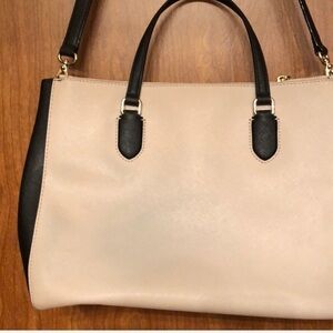 Kate Spade Cream and Black Large Leather Satchel Handbag with Crossbody Strap.