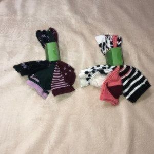 1- burgundy with lilac polka dots on foot and pink stripes on calf