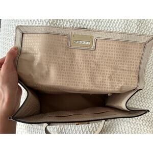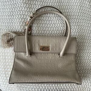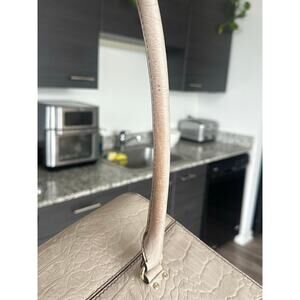White Kate Spade Croc handbag in the color sidewalk (will include bag scarf for an extra $3). The bag is a cool tone grey/tan/off-white color. The front has a gold closing mechanism. This bag is in poor condition on the outside specifically on the handles. I used a scarf to cover up the distressing on the handle part. I picked it up at a thrift without realizing how dirty the outside was. It may be able to be cleaned up but I'm not 100% sure if the color of the leather has worn off or if it is stained. I am hoping to just make some of my money back on it. The inside is in great condition with the exception of one stain on the inside of the flap. The bag appears to have really never been used as it still has one of the purchase stickers in it, it was most likely just stored improperly.