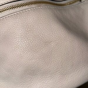 Cute cross body in neutral beige—goes with everything. Please see photos, there are some smudges, a divot and some worn away areas on the bottom.