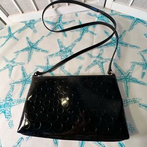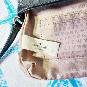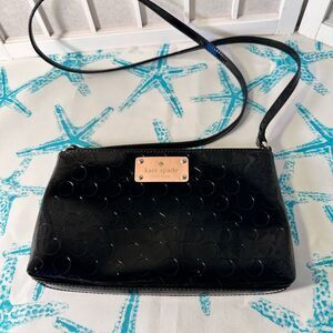Kate Spade Patent Embossed Spade Print Crossbody. This bag, designed with the modern woman in mind, boasts a black leather exterior with a patent finish, featuring the iconic Kate Spade spade print. Perfect for any occasion, this crossbody style bag is spacious enough to hold all your essentials and features an adjustable strap for comfort.