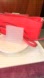 Interior is lined in matching red 2-way script pattern fabric