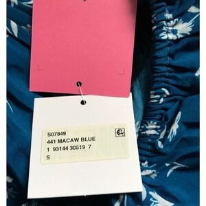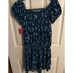 Brand New Spring 2022 Macaw Blue Off the shoulder neckline Floral Print Slip On Style Half Button Placket Short puff sleeves with elasticized sleeve hems Popover Bodice Wide Legs Elasticized Waist Elastic at shoulders and hips Adjustable cinched waist selftie with silver hardware Mid-Thigh Length 100% Rayon Hand wash. Approximate Measurements Laying Flat Armpit to Armpit 16" (unstretched) Shoulder to Hem 34" Inseam 4"