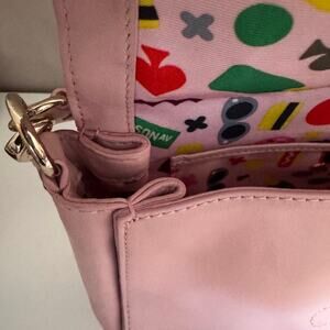 OTHER: single flat shoulder strap, donut adornment at front, slip pocket at back, pink and multicolor print lining, single slip pocket at interior wall, and magnetic closure at front flap