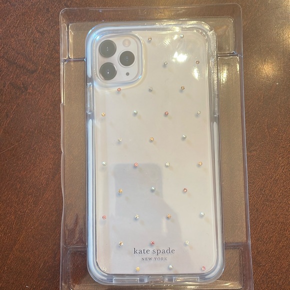 An authentic Kate Spade New York product, The Defensive Hardshell Series Case for Apple iPhone 11 Pro Max smartphones. Pearl and Gem Pin Dots, over a transparent shell design with white border lining