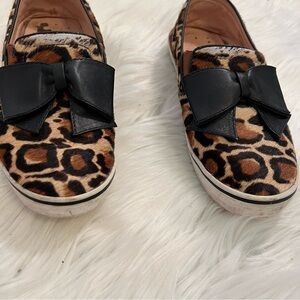 Good condition, some of the hair has rubbed off from pants touching and there is some buildup on inside of shoe as pictured. Kate Spade New York. Delise Leopard Print Slip On Sneakers. Animal Print. Leather Bow. Dyed Calf Hair, Oversized Napa Leather Bow, Elastic Insets. Leather Lining. Size 6.5B. Smoke free home. No trades, offers welcome.