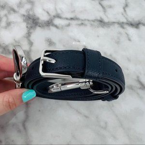 Brand new with the tag Authentic Color is denim Can be worn as a crossbody or shoulder bag Denim fabric Pebble leather trim Metal pinmount logo Two way spade jacquard lining Interior front slip & back zip pockets Detachable coin purse Top zip closure Purple and white stripped crossbody strap as well as additional all blue strap included 8.5"h x 11.87"w x 3"d Total strap drop: 49" longest length Same or next day shipping!