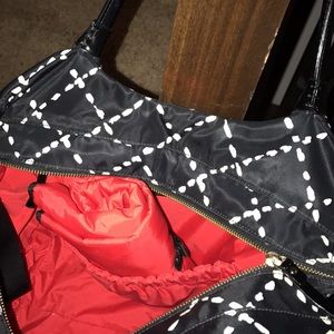 Large satchel style Kate Spade diaper bag, gently used, has some ink marks inside on bottom but otherwise in in great condition and looks new from the outside. Black and white material with red lining, easy to clean, diaper changing pad included.
