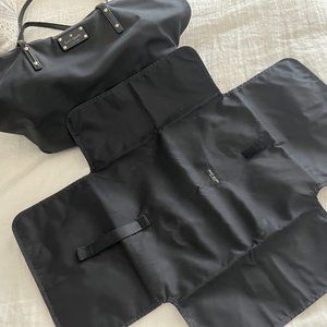 Authentic Kate Spade Designer Baby/Diaper bag. 20" wide x 12" tall (without straps) x 7" deep. One interior zip pocket and one interior open pocket. Two clips for pacifies, keys, small toys, etc. Foldable changing pad included. Lightly used and well cared for.