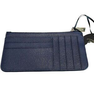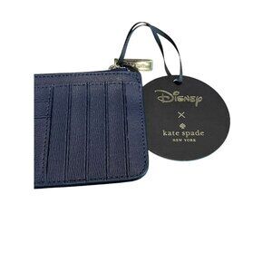 This Kate Spade card wallet features a stylish animal print pattern in shades of blue, with a zip-around closure and accents of a zipper and logo. It is designed for women who love designer accessories and features credit card slots for easy organization. The wallet is made of high-quality leather and is perfect for everyday use or special occasions. The size is large and slim, making it easy to carry in your purse or bag. The wallet is ideal for fans of the Lady & The Tramp character and is a must-have for any collector.