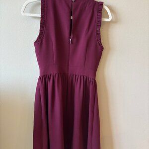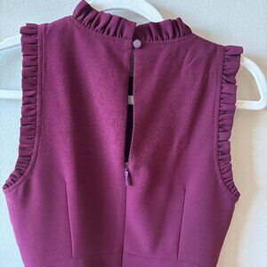 A-line sleeveless purple dress with ruffle detail at neck and arm opening