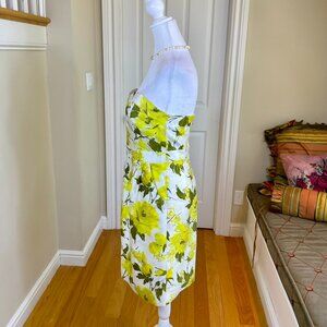Really beautiful floral strapless yellow knee length short dress, pockets, back zip, light boning