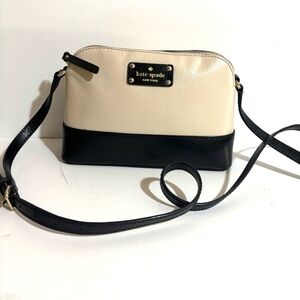 This Kate Spade crossbody bag showcases a sophisticated black and cream color-block design, perfect for adding a touch of elegance to any outfit. Its structured shape and adjustable strap offer both style and practicality, making it an ideal accessory for everyday use. The minimalist design is complemented by a subtle metal detail on the front, enhancing its timeless appeal. Main compartment 1 open pocket at interior wall lining minor stains logo at front hight 6.5” wide 10” depth 3” strap straps 22 adjustable The dimensions are based on approximately measurements before placing an order please check take a moment to view all photos using feature for a closer look
