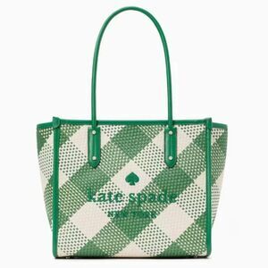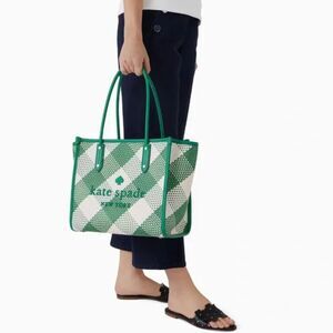 Kate Spade Ella Oversized Gingham Woven Straw Large Tote Bag, Green Bean Wallet