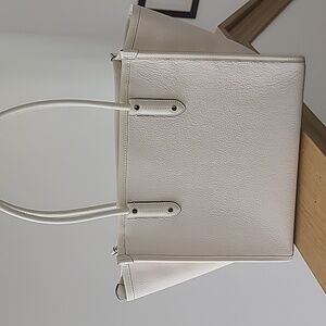 Chic ivory tote with elegant design. Features iconic logo. Ideal for daily use.