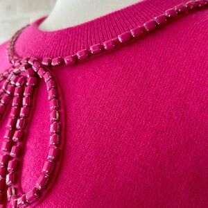 This is a beautiful cashmere and wool blend Kate Spade sweater in Snapdragon Pink. The jewels are substantially secured and it comes with extra in case you need them. The zipper pull is wrapped in plastic so it is shiny and so pretty!