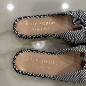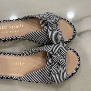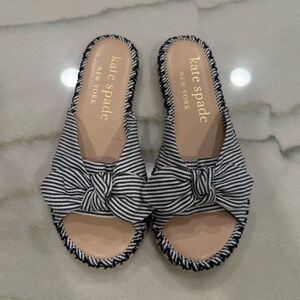 Kate Spade espadrille slide sandals in size 7. Saltie Shore style. Navy and white striped pattern with bow detail.